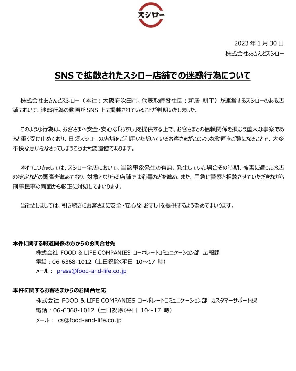 さらにさらに、スシローからも公式に文書を発出。