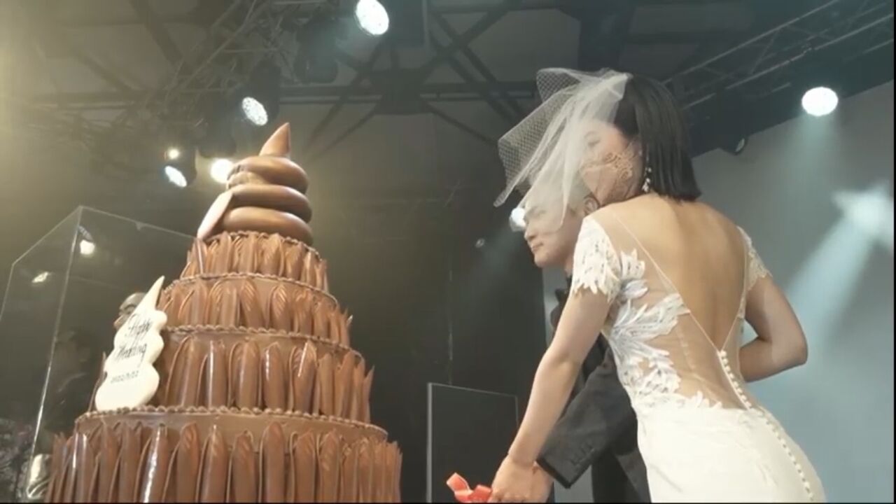 うんこちゃんに因んだうんこウエディングケーキ入刀のシーンですが、嫁さんのスタイルの良さが分かりますね、非常にセクシーです。