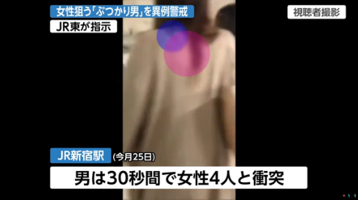 2018年5月女性狙う「ぶつかり男」を異例警戒 JR東日本が指示・JR新宿駅の構内で、女性にわざとぶつかりながら歩く男が出没しているのを受けて、JR東日本が、警備員などに警戒を強化するよう指示したことがわかった。