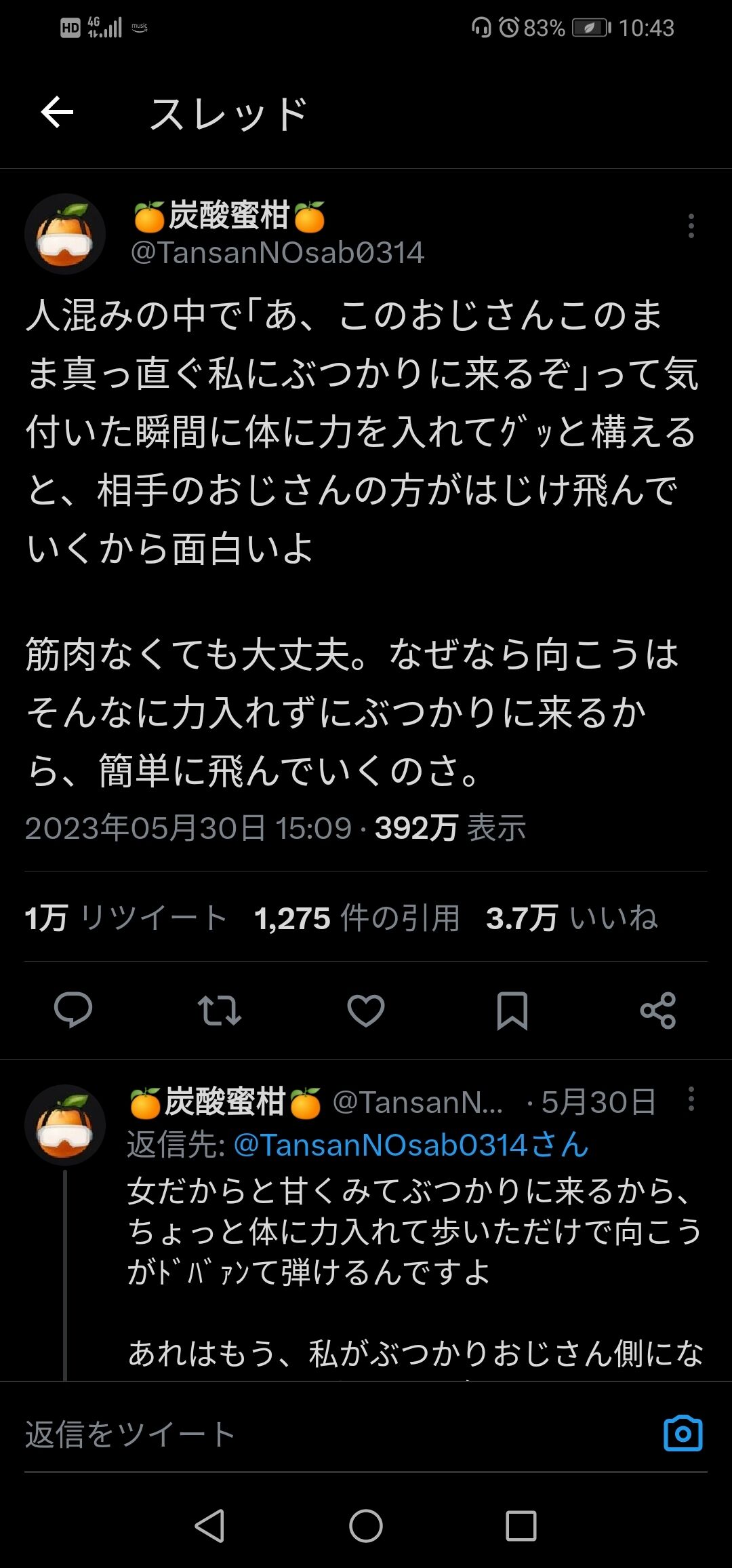 人混みの中で「あ、このおじさんこのまま真っ直ぐ私にぶつかりに来るぞ」って気付いた瞬間に体に力を入れてグッと構えると、相手のおじさんの方がはじけ飛んでいくから面白いよ